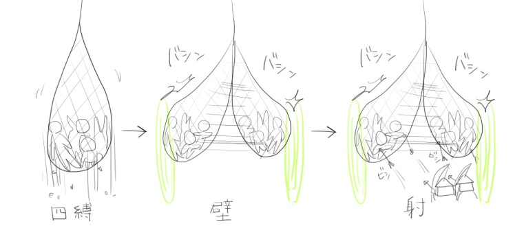 元親で四縛(捕獲)→元就で壁設置→(勝手に当たり続ける)→元就で射(駄目押し)